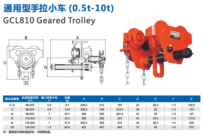 常規型手拉小車 GCL/GCT810系列小車選用了全新的高強度低合金結構鋼,確保4倍安全載荷,輕巧、安全、安裝方便、是目前最為輕巧小車之一。 1.采用優質鋼材,結構緊湊,外型美觀。 2.國際標準生產,安全性能可靠。 3.可多種選擇,“H”型鋼、“I”型鋼均可適用。